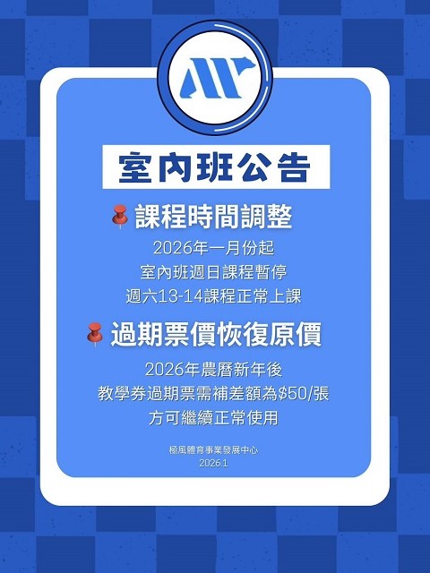 📣【室內班公告】一直以來,我們都很重視每一堂課的品質與大家的上課體驗,經過討論與整體評估後,決定做出以下調整,希望能讓課程運作更穩定、也讓大家上課更安心❤️✅課程時間調整週日班課程暫停,週六班13-14正常上課✅過期票恢復原價2026農曆年後,教學券過期補差額$50/張,